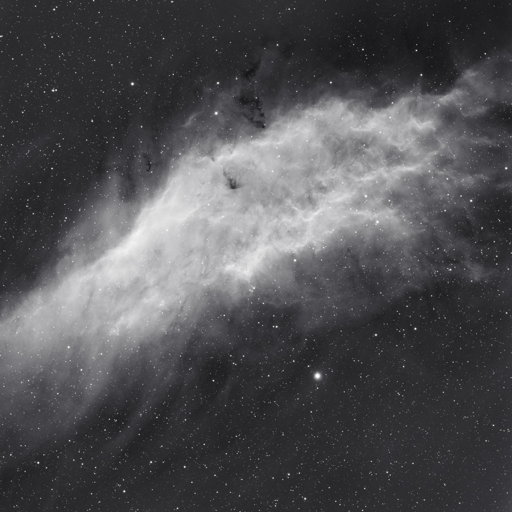 | Telescope: Astro-Physics 130 GT | Designation:The California Nebula (NGC 1499) is an emission nebula located in the constellation Perseus. It is so named because it appears to resemble the outline of the State of California. It is almost 2.5° long on the sky and, because of its very low surface brightness, it is extremely difficult to observe visually. It lies at a distance of about 1,000 light years from Earth. Its fluorescence is due to excitation of the Hß line in the nebula by the nearby prodigiously energetic O7 star, xi Persei (also known as Menkib. The California Nebula was discovered by E. E. Barnard in 1884. |