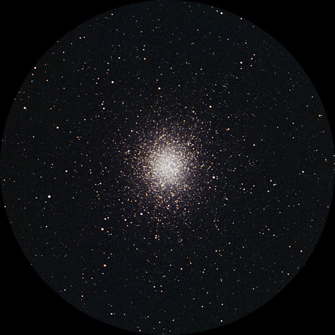 Subject: NGC5139 Omega Cenntauri Exposure: Two 25 Minute on Hypered 400 PPF Processing: Registered in Registar, blended in PW and adjusted in Adobe Photoshop Telescope: Astro Physics 180 EDF Starfire AP 1200 Mount and ST-V Guider May 11, 2002 Casitas de Gila, Gila New Mexico |