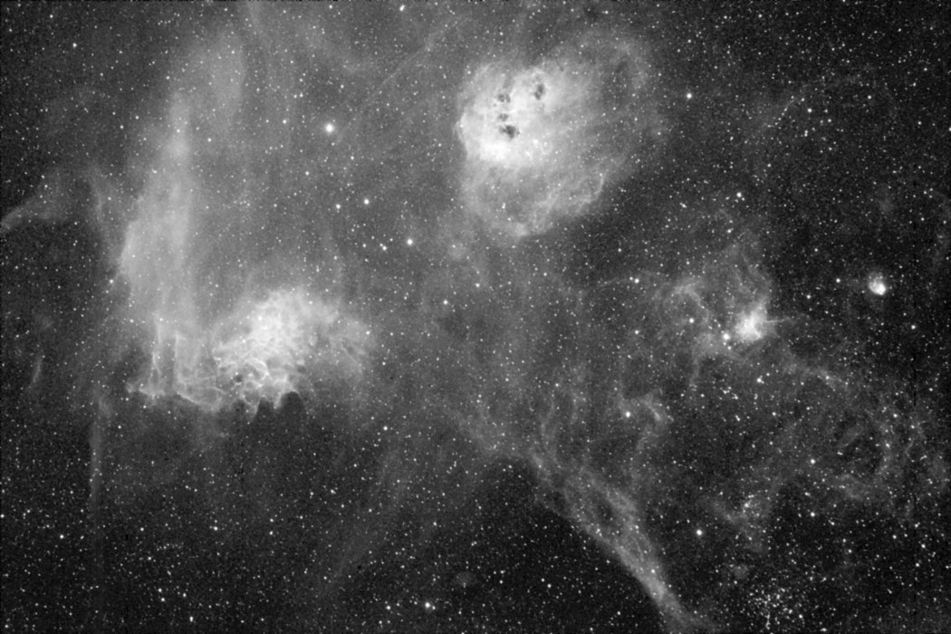 Subject: IC405, 410, 417, NGC1931 and M38 in Auriga The above image is a sum of 14, 10 minute SBIG ST-8 images Filter: Custom Scientific 3 nm Ha Processing: Maxim and Photoshop Telescope: Pentax Medium Format 165mm Telephoto using a Brady Johnson Adapter AP 1200 Mount and ST-237 Guider January 28th, 2004, Roadrunner Observatory, My Backyard, Palm Desert, California |