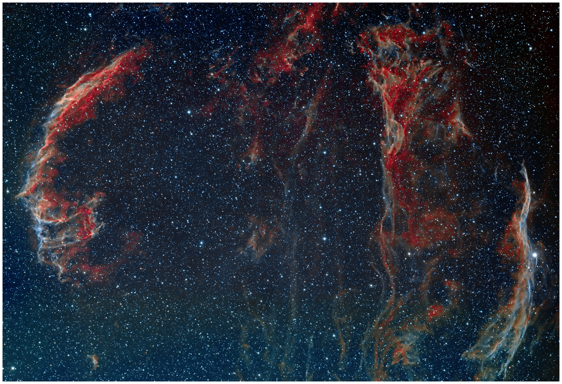 | Telescope: Stellarvue 80mm Triplet | Designation:In modern usage, the names Veil Nebula, Cirrus Nebula, and Filamentary Nebula generally refer to all the visible structure of the remnant, or even to the entire loop itself. The structure is so large that several NGC numbers were assigned to various arcs of the nebula.[11] There are three main visual components: The Western Veil (also known as Caldwell 34), consisting of NGC 6960 (the "Witch's Broom",[12] Lacework Nebula,[8] "Filamentary Nebula"[12]) near the foreground star 52 Cygni; The Eastern Veil (also known as Caldwell 33), whose brightest area is NGC 6992, trailing off farther south into NGC 6995 (together with NGC 6992 also known as "Network Nebula"[13]) and IC 1340; and Pickering's Triangle (or Pickering's Triangular Wisp), brightest at the north central edge of the loop, but visible in photographs continuing toward the central area of the loop. NGC 6974 and NGC 6979 are luminous knots in a fainter patch of nebulosity on the northern rim between NGC 6992 and Pickering's Triangle Wiki |
