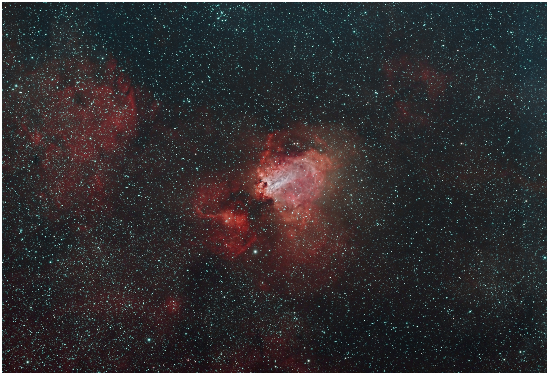 | Telescope: Stellarvue 80mm Triplet | Designation:M17 The Omega Nebula, also known as the Swan Nebula, Checkmark Nebula, Lobster Nebula, and the Horseshoe Nebula (catalogued as Messier 17 or M17 or NGC 6618) is an H II region in the constellation Sagittarius. It was discovered by Philippe Loys de Chéseaux in 1745. Charles Messier catalogued it in 1764. It is by some of the richest star fields of the Milky Way, figuring in the northern two-thirds of Sagittarius. The Omega Nebula is between 5,000 and 6,000 light-years from Earth and it spans some 15 light-years in diameter. The cloud of interstellar matter of which this nebula is a part is roughly 40 light-years in diameter and has a mass of 30,000 solar masses. The total mass of the Omega Nebula is an estimated 800 solar masses. It is considered one of the brightest and most massive star-forming regions of our galaxy. Its local geometry is similar to the Orion Nebula except that it is viewed edge-on rather than face-on Wiki |