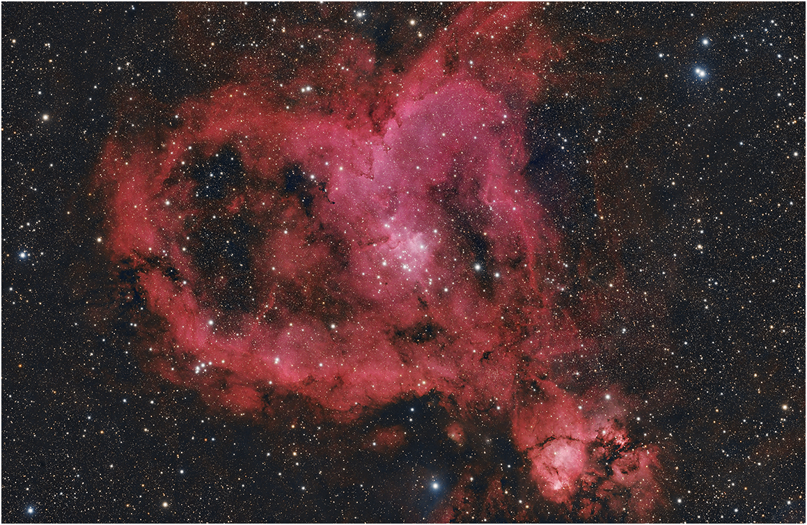 | Telescope: Astro-Physics 092 Stowaway | Description:The Heart Nebula (IC1805) (also known as the Running Dog Nebula, Sharpless 2-190) is an emission nebula, 7,500 light-years (2,300 pc) away from Earth and located in the Perseus Arm of the Galaxy in the constellation Cassiopeia. It was discovered by William Herschel on 3 November 1787. It displays glowing ionized hydrogen gas and darker dust lanes. The brightest part of the nebula (a knot at its western edge) is separately classified as NGC 896, because it was the first part of the nebula to be discovered. The nebula's intense red output and its morphology are driven by the radiation emanating from a small group of hot stars near the nebula's center. This open cluster of stars, known as Collinder 26, Melotte 15, or IC 1805, contains a few bright stars nearly 50 times the mass of the Sun, and many more dim stars that are only a fraction of the Solar mass. The Heart Nebula is also made up of ionized oxygen and sulfur gases, which are responsible for the rich blue and orange colors seen in narrowband images. The nebula also spans almost 2 degrees in the sky, covering an area four times that of the diameter of the full moon. (Wiki). |