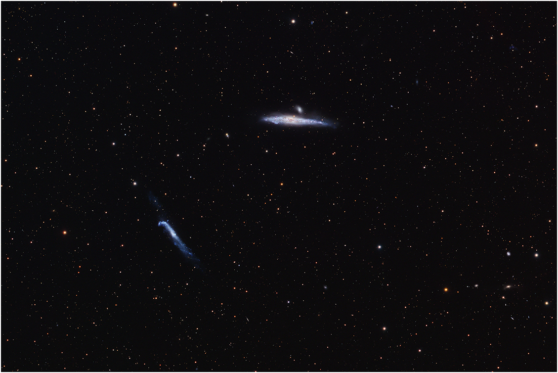 | Telescope: Astro-Physics 092 Stowaway | Description:NGC 4631 and NGC 4656 The Whale and the Hockey Stick. NGC 4631 (also known as the Whale Galaxy or Caldwell 32) is a barred spiral galaxy in the constellation Canes Venatici about 30 million light years from Earth. It was discovered on 20 March 1787 by German-British astronomer William Herschel. This galaxy's slightly distorted wedge shape gives it the appearance of a whale, hence its nickname. Because this nearby galaxy is seen edge-on from Earth, professional astronomers observe this galaxy to better understand the gas and stars located outside the plane of the galaxy. NGC 4631 contains a central starburst, which is a region of intense star formation. The strong star formation is evident in the emission from ionized hydrogen and interstellar dust heated by the stars formed in the starburst. The most massive stars that form in star formation regions only burn hydrogen gas through fusion for a short period of time, after which they explode as supernovae. So many supernovae have exploded in the center of NGC 4631 that they are blowing gas out of the plane of the galaxy. This superwind can be seen in X-rays and in spectral line emission. The gas from this superwind has produced a giant, diffuse corona of hot, X-ray emitting gas around the whole galaxy. NGC 4656/57 is a highly warped edge-on barred spiral galaxy located 30 million light years away from Earth. This galaxy is sometimes called the Hockey Stick Galaxy or the Crowbar Galaxy. Its unusual shape is thought to be due to an interaction between NGC 4656, NGC 4631, and NGC 4627. The galaxy is a member of the NGC 4631 Group. A luminous blue variable in "super-outburst" was discovered in NGC 4656/57 on March 21, 2005. (Wiki). |
