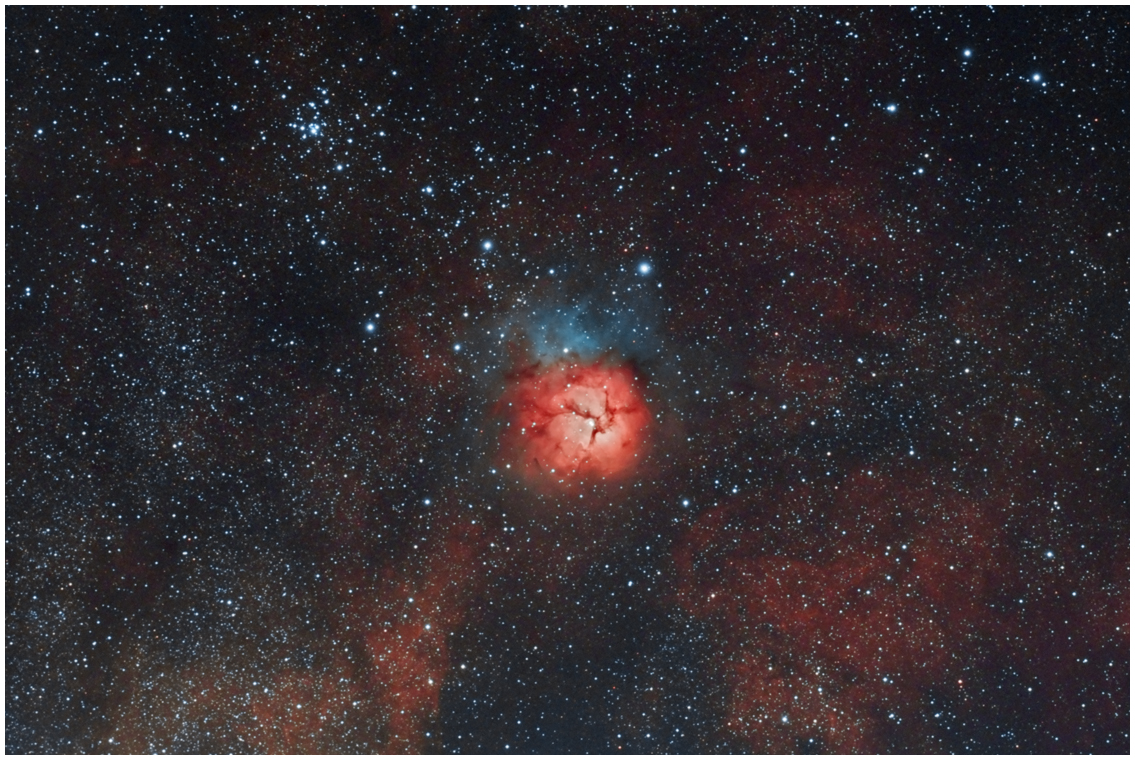 | Telescope: Stellarvue 80mm Triplet | Designation:The Trifid Nebula (catalogued as Messier 20 or M20 and as NGC 6514) is an H II region in the north-west of Sagittarius in a star-forming region in the Milky Way's Scutum-Centaurus Arm. It was discovered by Charles Messier on June 5, 1764. Its name means 'three-lobe'. The object is an unusual combination of an open cluster of stars, an emission nebula (a relatively dense, red-yellow portion), a reflection nebula (the mainly NNE blue portion), and a dark nebula (the apparent 'gaps' in the former that cause the trifurcated appearance also designated Barnard 85). Viewed through a small telescope, the Trifid Nebula is a bright and peculiar object, and is thus a perennial favorite of amateur astronomers. Wiki |